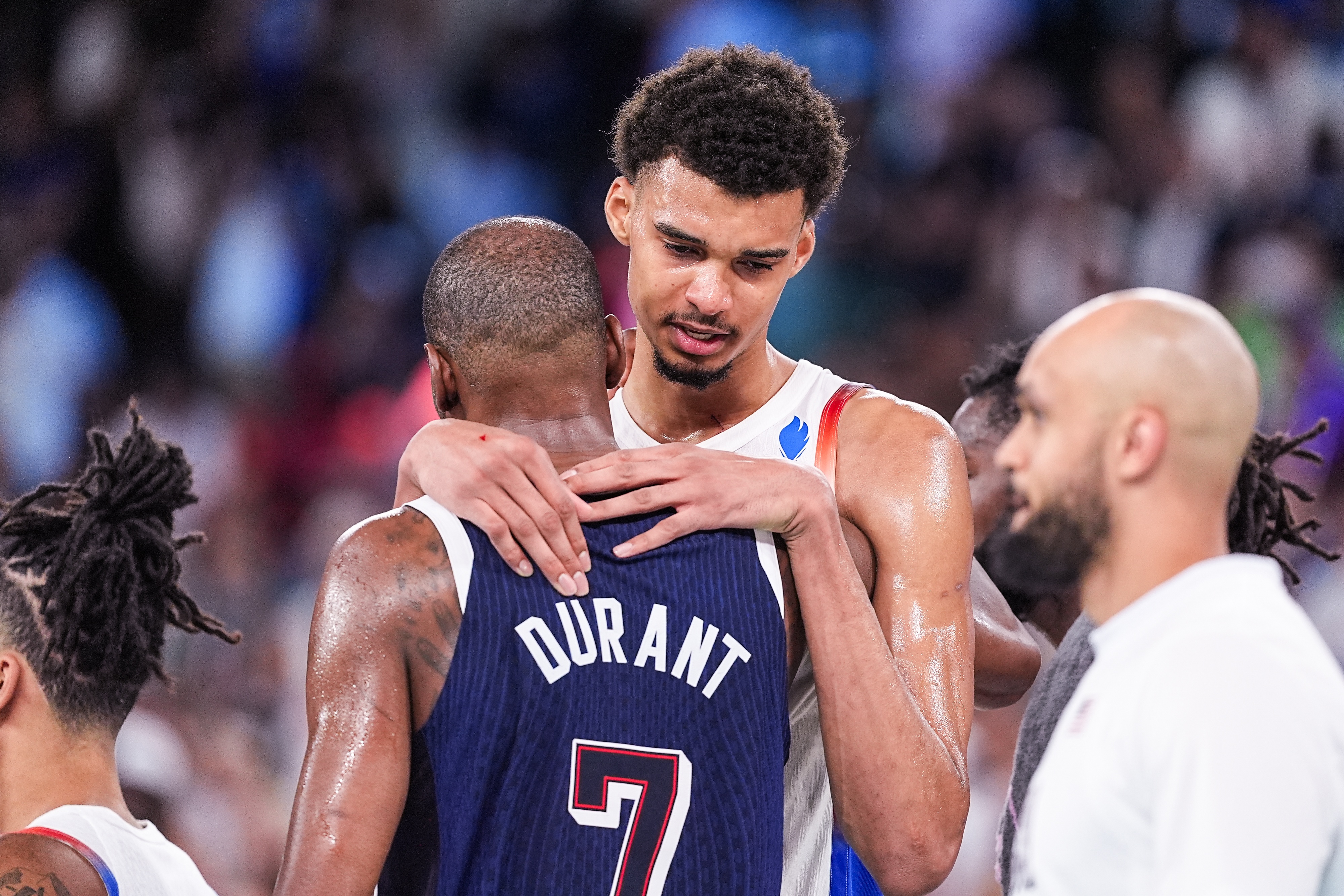 去年夏天,當(dāng)代表法國男籃的維克托-文班亞馬在其家鄉(xiāng)舉辦的奧運會上距離金牌僅差一場勝利時,他感到很難過……為那些擋在他和他的目標(biāo)之間的對手感到難過。