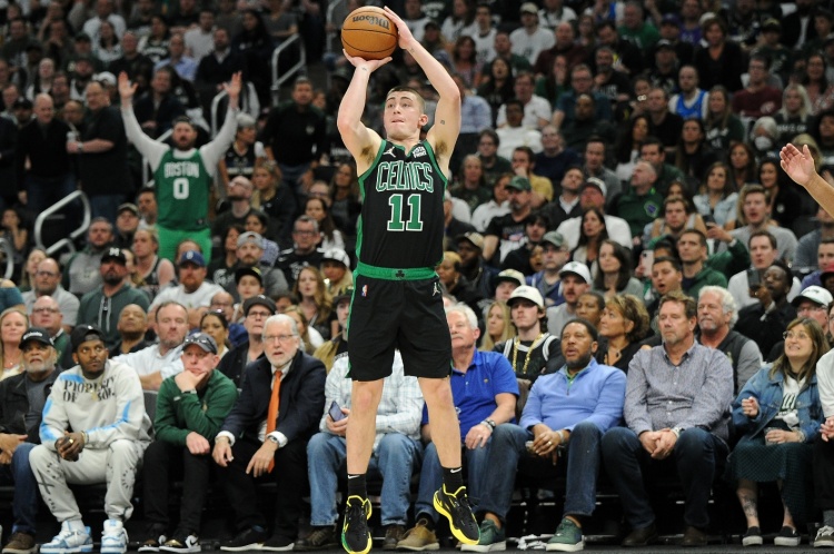 G5半場結(jié)束前4秒,普理查德替補登場。凱爾特人全隊接到指示,要盡力將球交到他手中。在東契奇罰球不中后,霍福德?lián)屜禄@板,迅速尋找普理查德。雖然看到東契奇上前干擾,但霍福德知道這位全明星來不及封堵。普理查德告訴自己:把球投出去,給它一個機會。起初,他完全沒有意識到周圍正在醞釀的瘋狂。