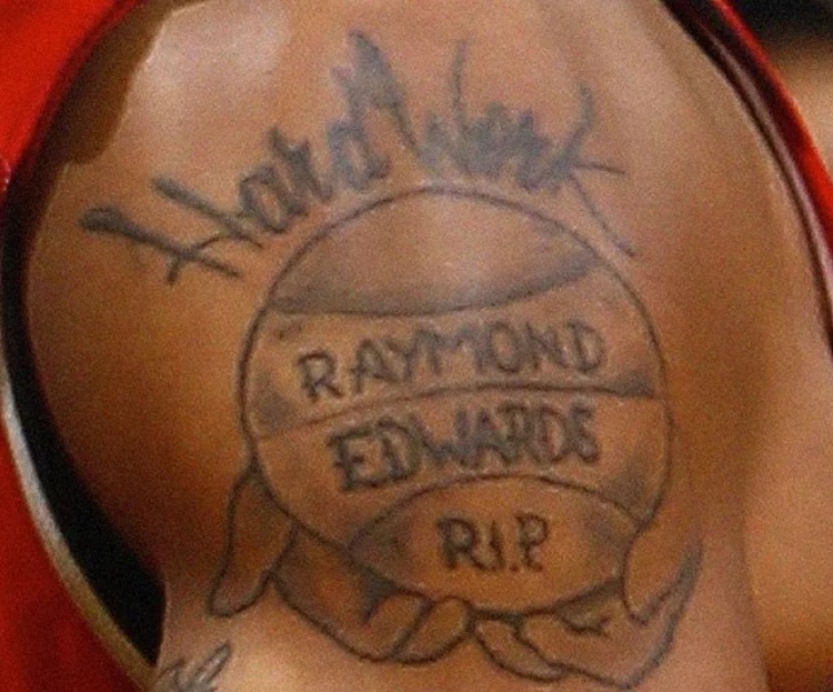 “如果我不打籃球的話,舅舅不會開心的。同時,我要承擔(dān)起責(zé)任,成為一家之主?!彼诩绨蛏衔牧艘粋€文身,在一雙祈禱的手上,刻著“努力工作”這幾個字,雙手握著一個籃球,籃球上寫著,“雷蒙德-愛德華茲,RIP”,努力工作、祈禱和籃球,這是他和舅舅之間,最牢不可破的紐帶。