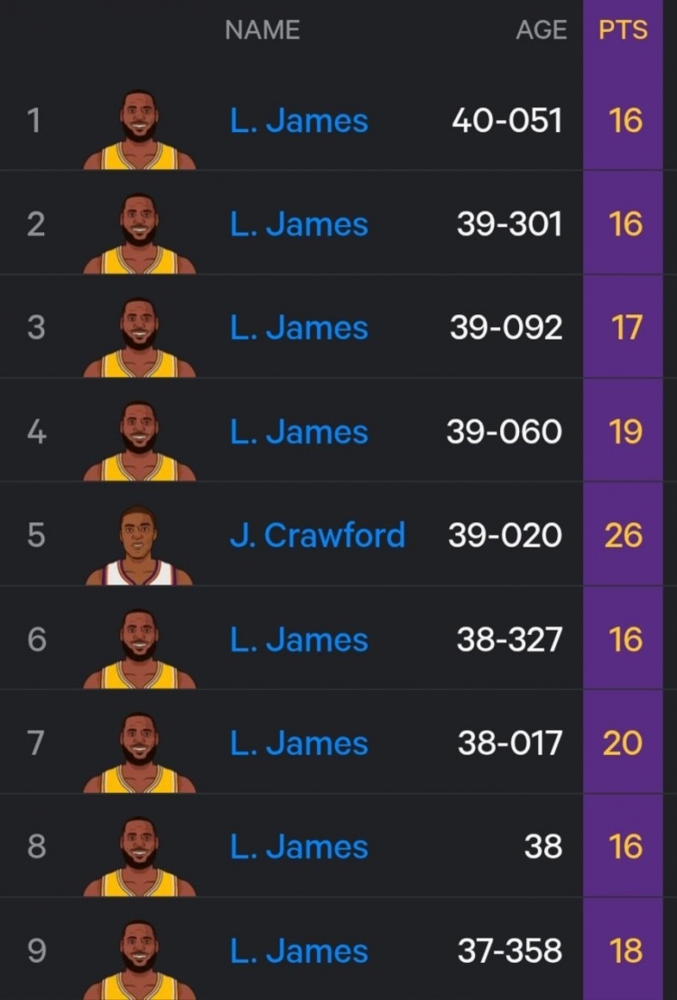 至此,40歲51天的詹姆斯再次刷新了自己保持的歷史最老末節(jié)得分16+紀錄,此前創(chuàng)紀錄時詹姆斯39歲301天。