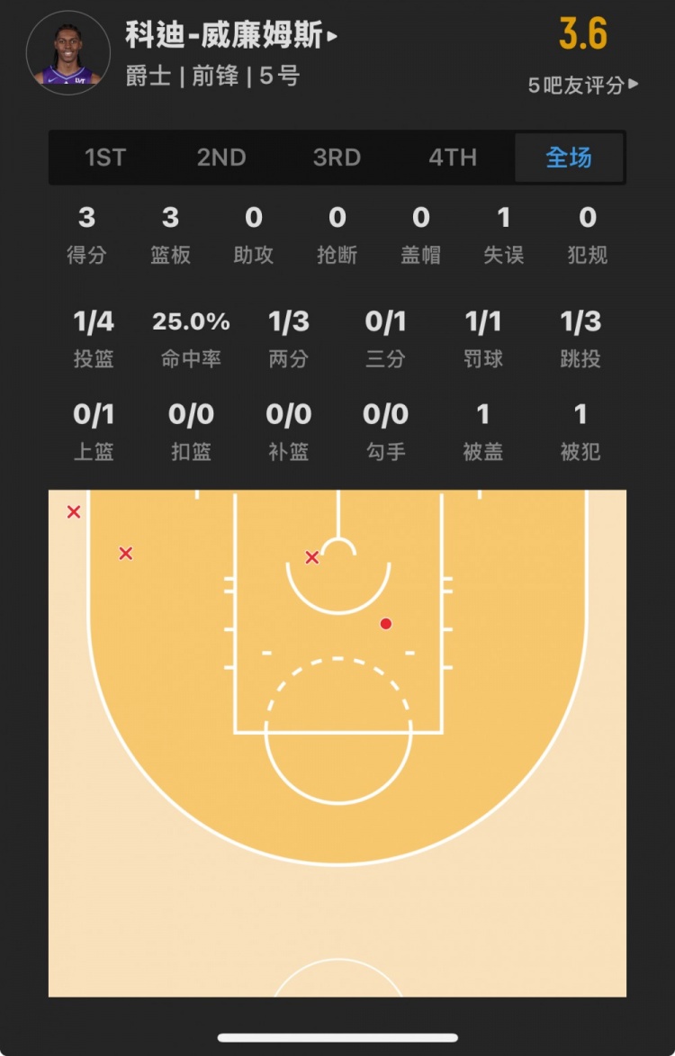 爵士10號秀 科迪-威廉姆斯 登場16.0分鐘