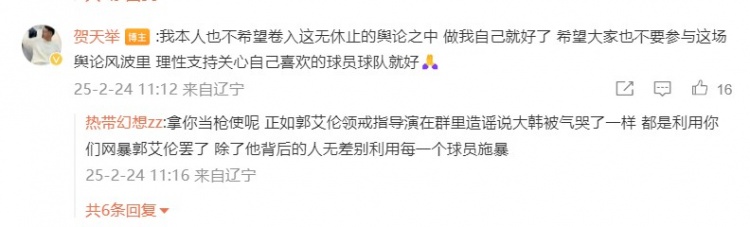 之后,賀天舉還在這條動態(tài)的評論區(qū)寫道:“我本人也不希望卷入這無休止的輿論之中 做我自己就好了 希望大家也不要參與這場輿論風(fēng)波里 理性支持關(guān)心自己喜歡的球員球隊就好????”