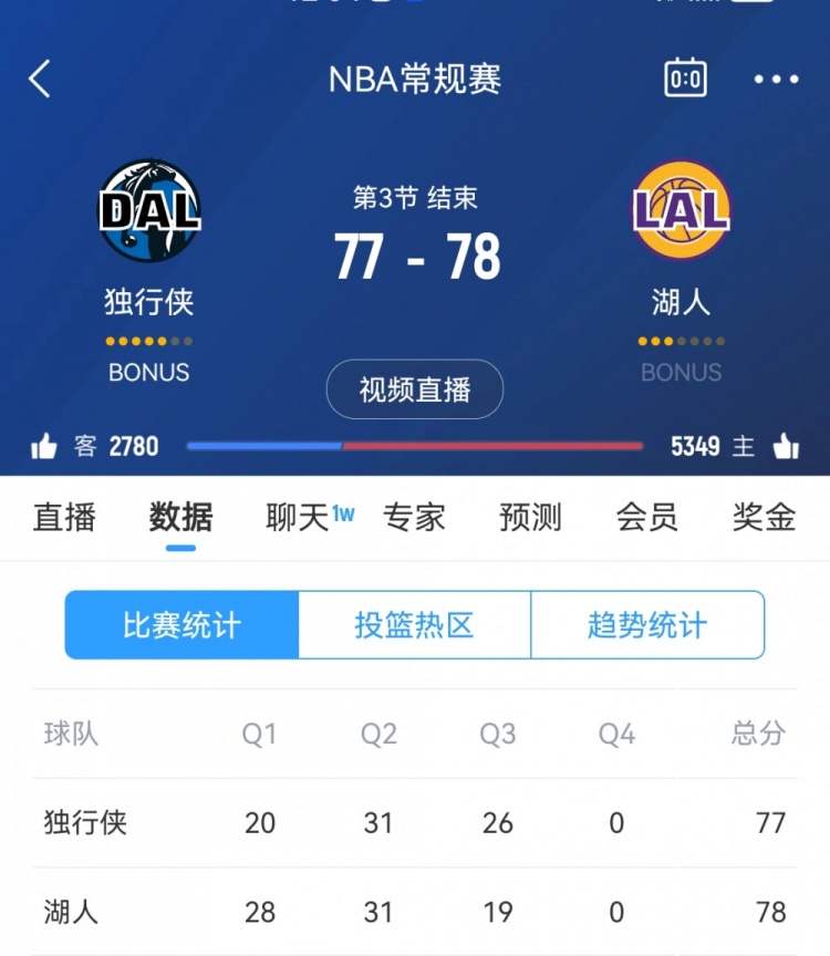 2月26日訊 NBA常規(guī)賽,獨行俠三節(jié)結(jié)束77-78落后湖人。