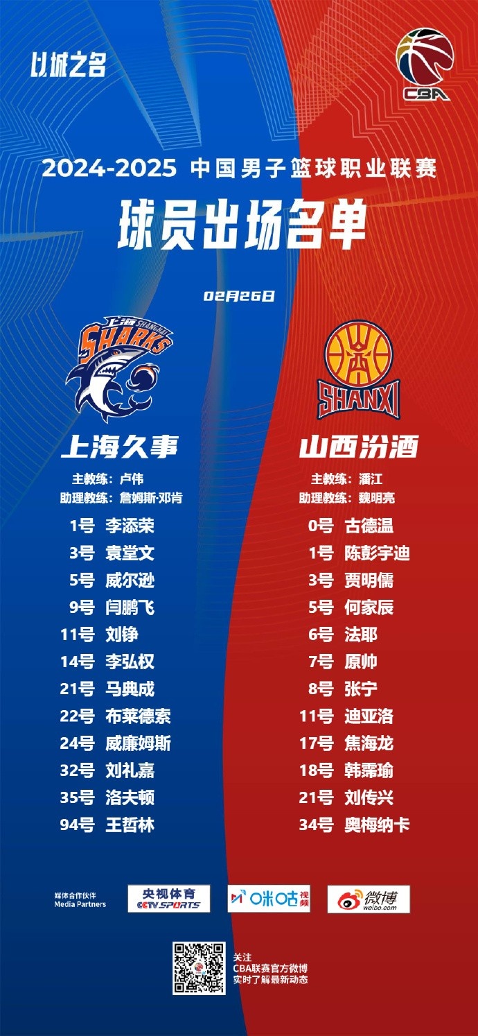賽前,CBA官方公布了本場大名單,上海隊(duì)新援多諾萬-威廉姆斯將迎來首秀,王哲林、張寧在列。具體如下: