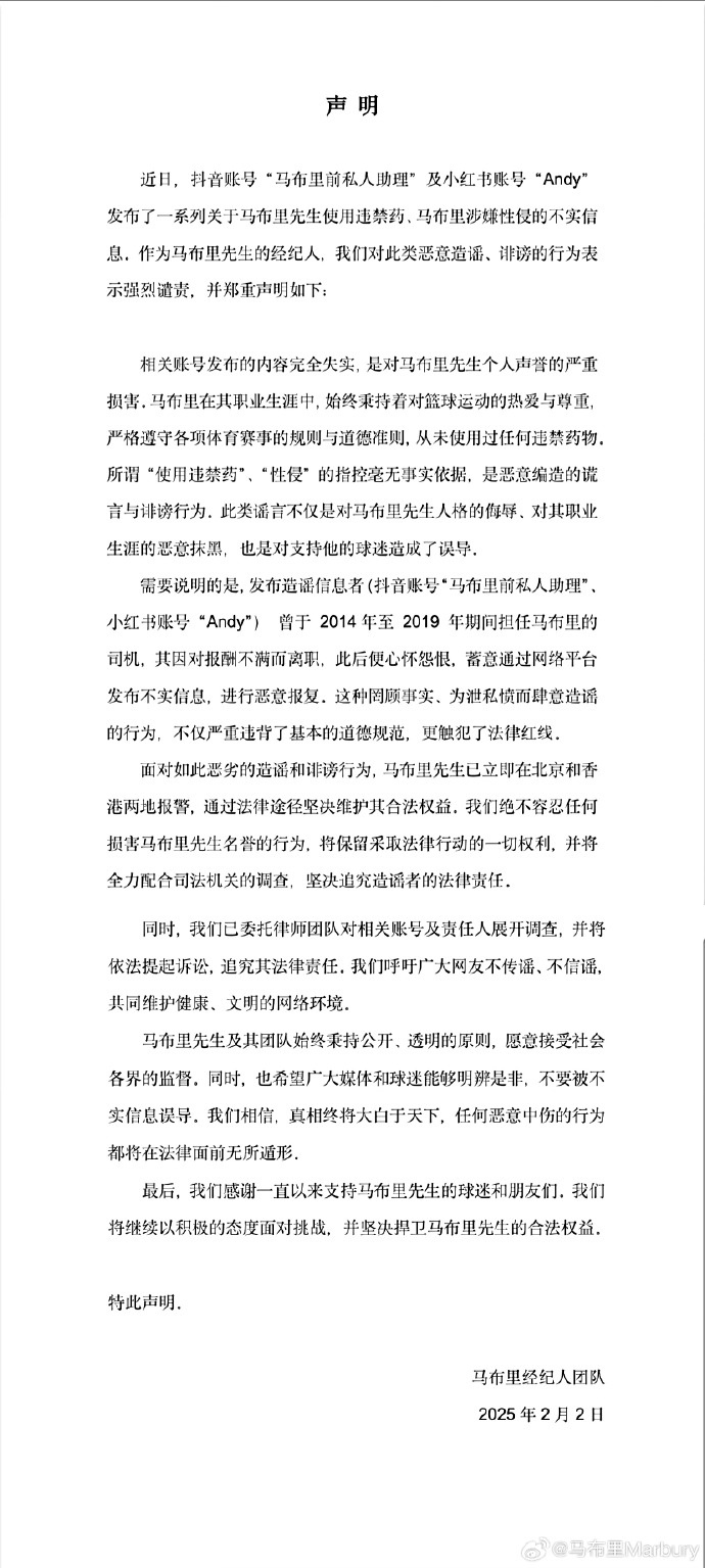 馬布里隨后通過個人微博發(fā)布了一篇其經(jīng)紀(jì)人團(tuán)隊撰寫的澄清信,證實(shí)了馬布里已報警的說法,并對“Andy”進(jìn)行了強(qiáng)烈譴責(zé),原文如下: