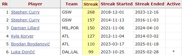 據(jù)統(tǒng)計,東契奇目前已經(jīng)連續(xù)100場比賽有三分入賬,是歷史上第5位做到的球員。