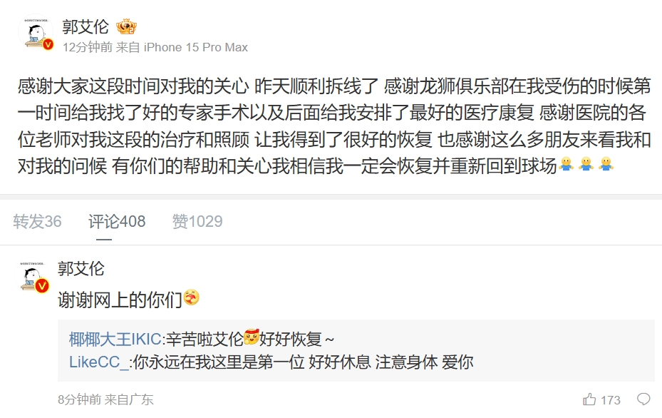 郭艾倫更博報(bào)平安:順利拆線了 我一定會(huì)恢復(fù)并回到球場!