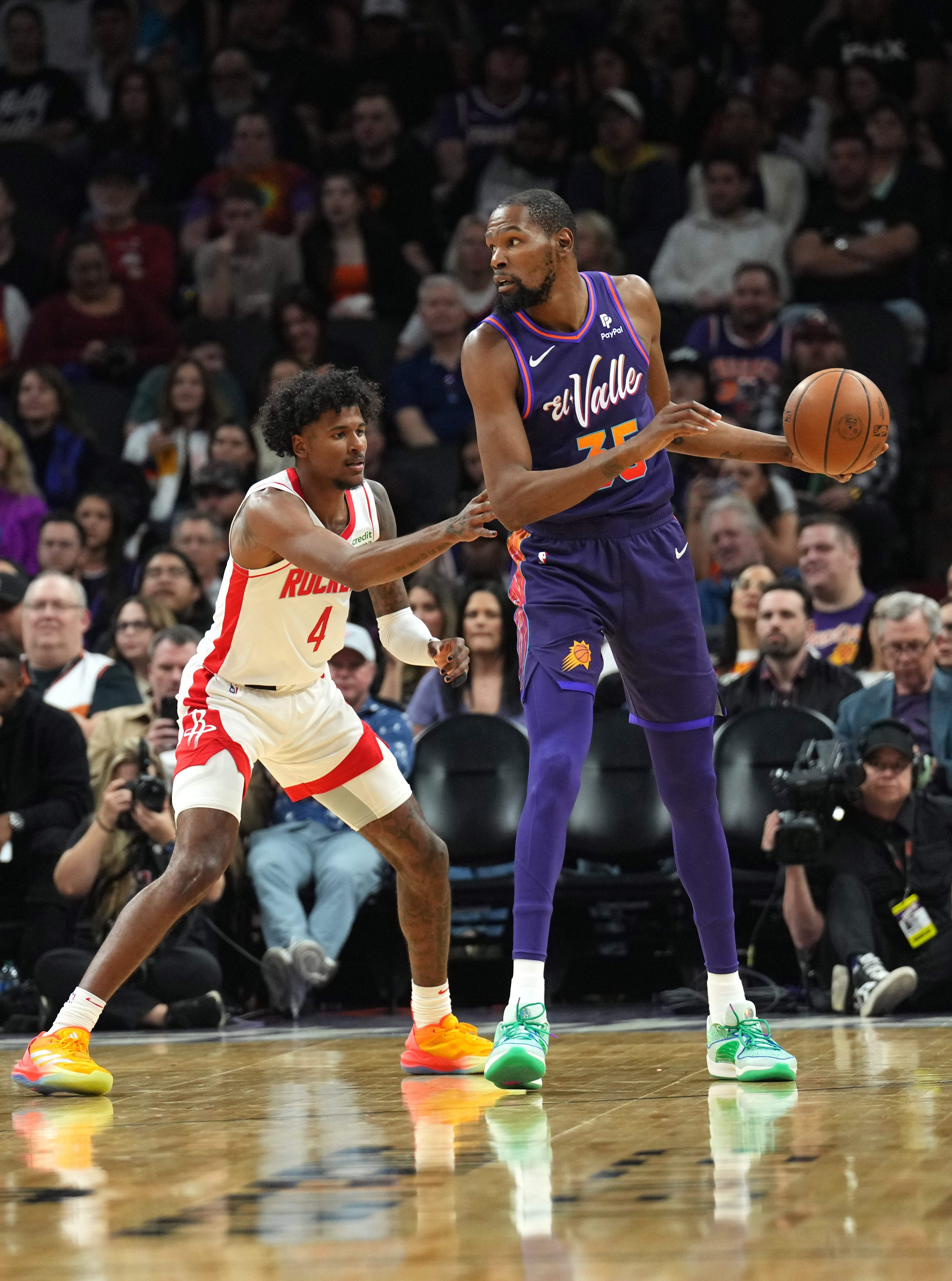 火箭是太陽完美的交易伙伴,主要有兩個原因。首先,杜蘭特完美填補(bǔ)了火箭最大的短板。憑借年輕的核心陣容和強(qiáng)悍的防守,火箭正在西部崛起。但他們?nèi)狈σ晃荒軌驇ьI(lǐng)球隊爭冠的頂級得分手,根據(jù)Cleaning the Glass網(wǎng)站的數(shù)據(jù),本賽季火箭的半場進(jìn)攻效率僅排名聯(lián)盟第25位。即使已經(jīng)36歲,杜蘭特也能在這一領(lǐng)域帶來顯著提升,他的使用率和真實命中率都遠(yuǎn)高于火箭輪換陣容中的任何一名球員。其次,火箭控制著太陽2025年、2027年和2029年的首輪簽,這些首輪簽最初是太陽在交易杜蘭特時送給籃網(wǎng)的。重新獲得部分或全部首輪簽將使太陽能為杜蘭特時代畫上圓滿句號,同時也讓球隊能夠在未來自由操作,而不必?fù)?dān)心失去樂透簽的風(fēng)險。