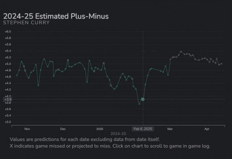 非常有趣的是,斯蒂芬的預(yù)計正負值在勇士隊交易得到吉米之后就完全像火箭一樣飛升了。