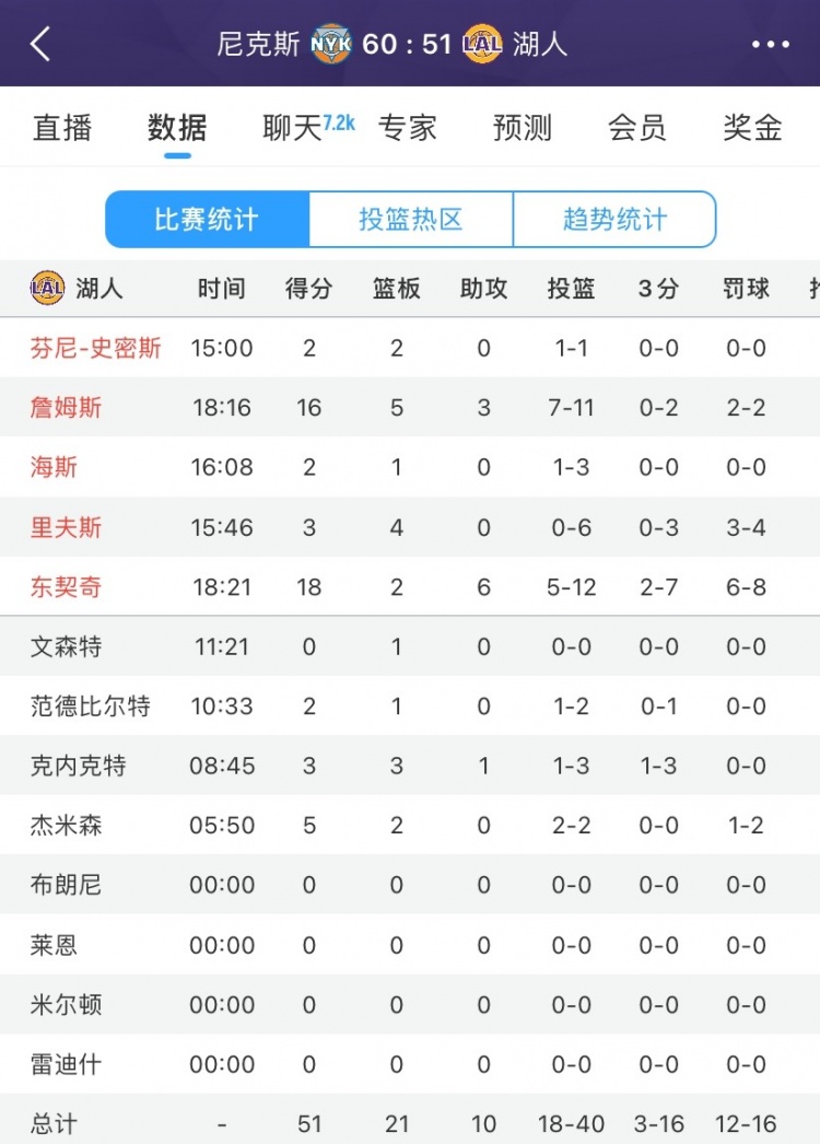 上半場(chǎng)比賽,湖人外線(xiàn)投射不在線(xiàn),射手也不準(zhǔn),全隊(duì)16投僅3中,命中率僅18.8%:東契奇7中2,克內(nèi)克特3中1,詹姆斯2中0,里夫斯3中0,范德比爾特1中0。