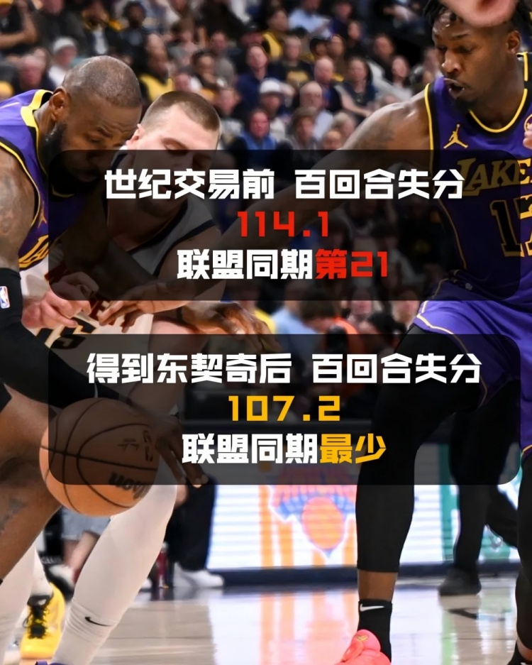而比起進(jìn)攻端如虎添翼,令人驚訝的是,他們?cè)诜朗囟烁谴虺隽饲八从械馁|(zhì)量。在一個(gè)被質(zhì)疑“防守有巨大問(wèn)題”的東契奇加入之后,湖人隊(duì)反而成為百回合失分同期最少的球隊(duì)。他們每百回合足足少丟了6.9分,成為交易日后聯(lián)盟獨(dú)一檔的防守鐵軍。