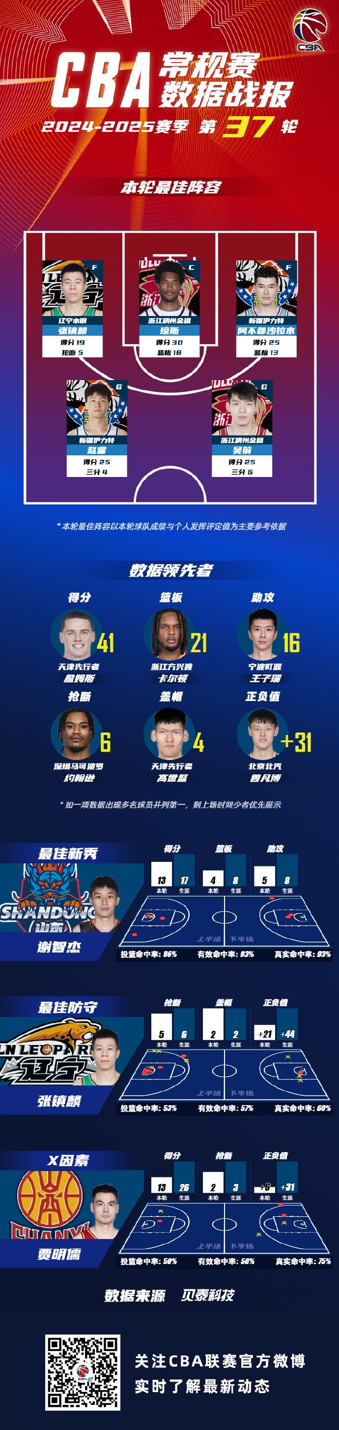 2024-2025賽季CBA聯(lián)賽常規(guī)賽第37輪結(jié)束較量,來自遼寧沈陽三生飛豹籃球俱樂部的張鎮(zhèn)麟 ,浙江稠州籃球俱樂的瓊斯和吳前 ,新疆廣匯籃球俱樂部的阿不都沙拉木和趙睿入選CBA聯(lián)賽常規(guī)賽第37輪最佳陣容!