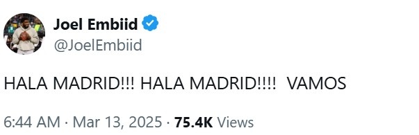恩比德更推道:“加油皇馬!加油皇馬!加油!”