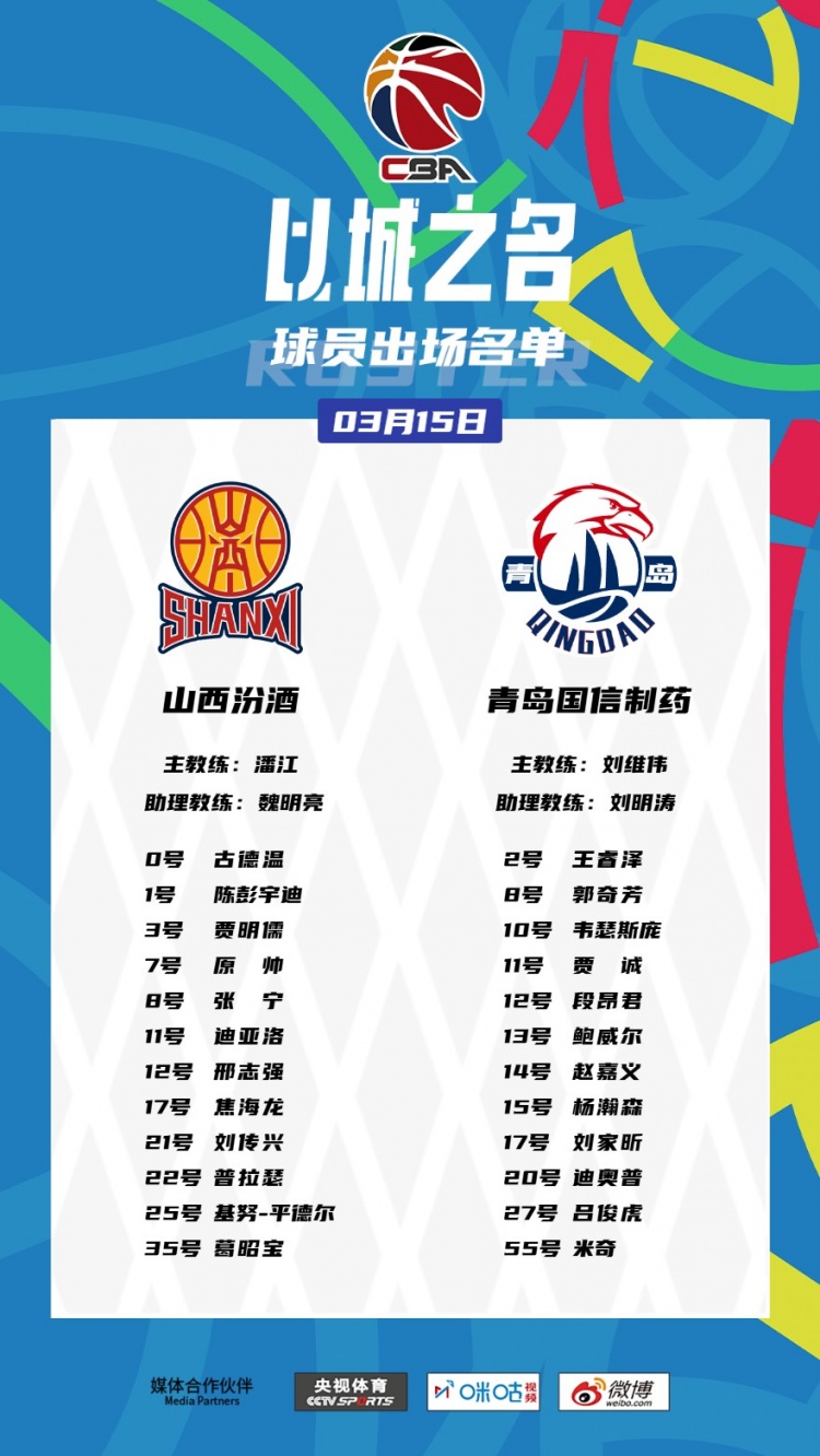 青島隊(duì):王睿澤、郭奇芳、韋瑟斯龐、賈誠、段昂君、鮑威爾、趙嘉義、楊瀚森、劉家昕、迪奧普、呂俊虎、米奇。