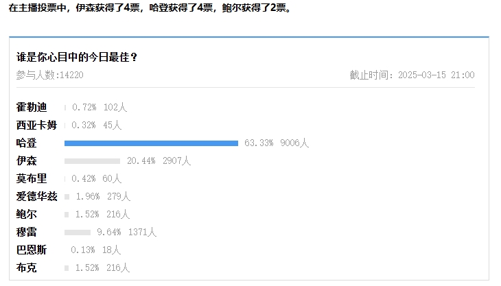 在主播投票中,伊森獲得了4票,哈登獲得了4票,鮑爾獲得了2票。