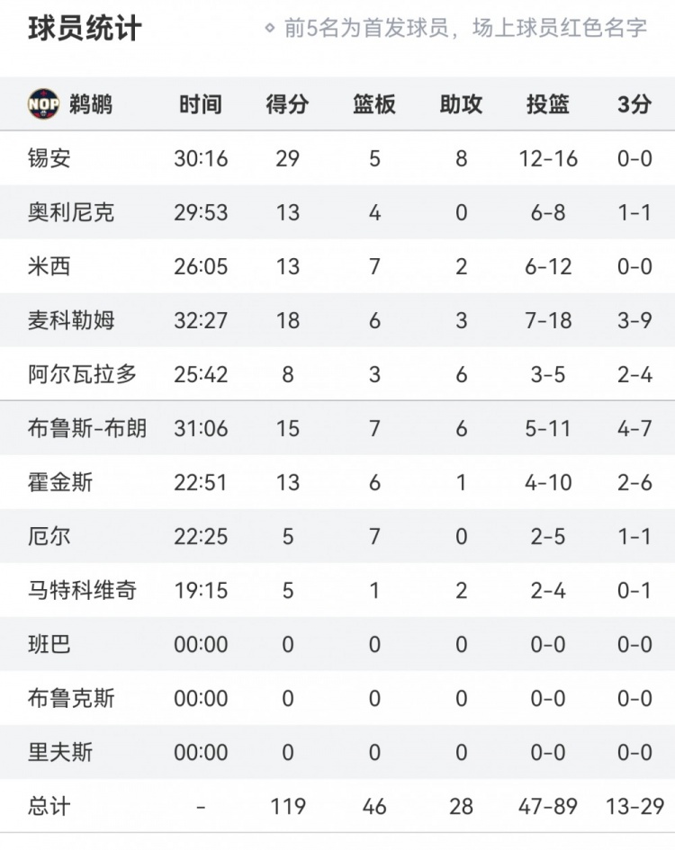 本場(chǎng)比賽,鵜鶘全隊(duì)多點(diǎn)開(kāi)花,共6人得分上雙。具體如下: