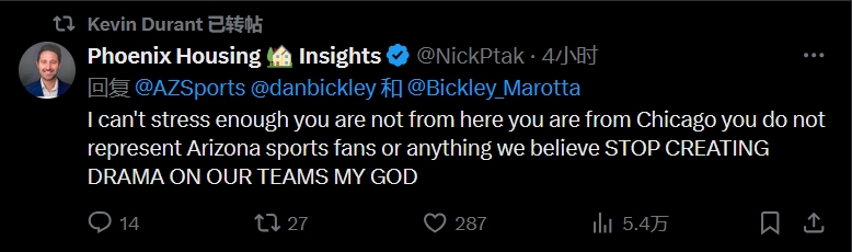 球迷一:我簡直不能更強(qiáng)調(diào)這一點,你不是本地人,你是芝加哥人,不能代表亞利桑那州的體育迷,也不能代表我們的任何想法。停止在我們的球隊制造鬧劇吧,老天?。?/p>