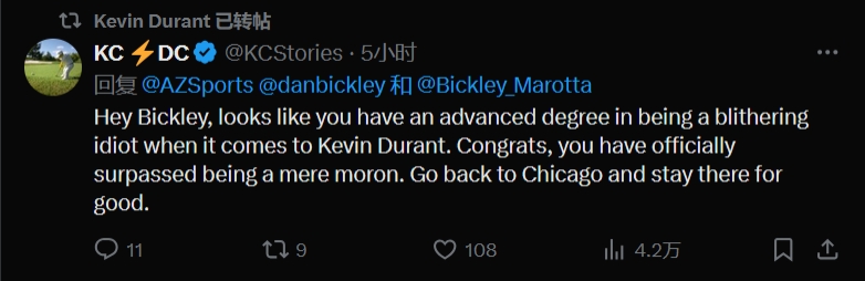 球迷三:嘿,看來你在"如何成為關(guān)于凱文-杜蘭特的胡說八道專家"這方面已經(jīng)獲得了高等學(xué)位。恭喜你,你正式超越了一個普通的白癡????。趕緊滾回芝加哥,永遠(yuǎn)待在那兒吧。