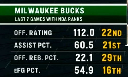 雄鹿近7場(chǎng)進(jìn)攻便秘:進(jìn)攻效率聯(lián)盟第22 助攻&前板百分比都20開(kāi)外