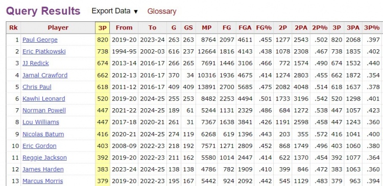 根據(jù)數(shù)據(jù)統(tǒng)計,加上已經(jīng)投進的1個三分,鮑威爾快船生涯三分數(shù)來到448記,他超越路威,獨居隊史三分榜第7位。