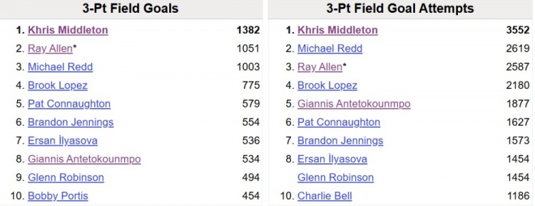 據(jù)統(tǒng)計(jì),米德?tīng)栴D在雄鹿生涯三分出手3552次,命中1382記,都是隊(duì)史紀(jì)錄。