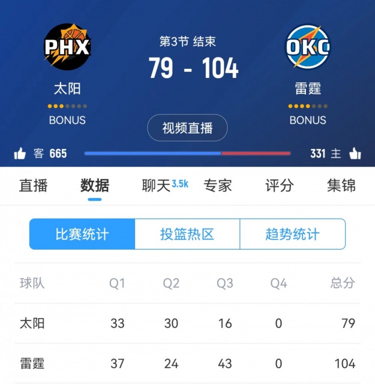 第三節(jié),雷霆攻防兩端壓制對手,單節(jié)43-16凈勝太陽27分,三節(jié)打完雷霆領(lǐng)先25分。
