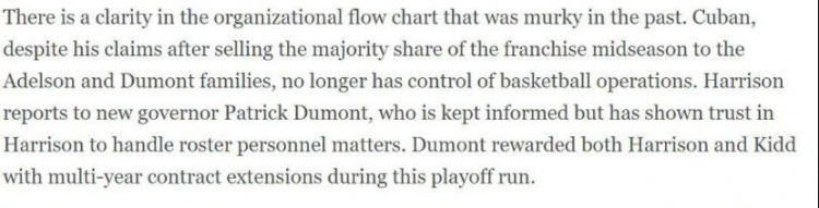 2024年6月底,選秀大會前夕,據(jù)ESPN的麥克馬洪報道,庫班已經(jīng)不再參與獨(dú)行俠隊的運(yùn)營工作,而由獨(dú)行俠隊的總經(jīng)理哈里森,直接向新老板杜蒙特匯報。