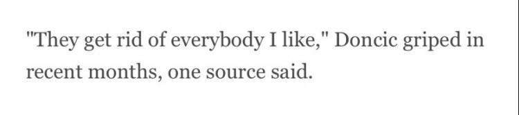 有消息稱,獨(dú)行俠曾經(jīng)向另一支球隊出售東契奇,試圖得到想要的球員,但遭到拒絕。但隊記方面對這一消息認(rèn)為不可信——一方面,其他球隊從未印證這一說法,而另一方面,“他從頭到尾,只想要戴維斯一個人?!?/p>