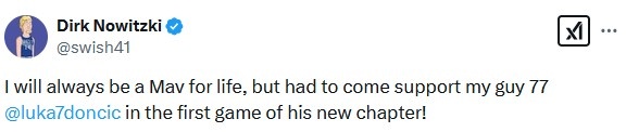 獨行俠名宿諾維茨基現(xiàn)場觀戰(zhàn),他發(fā)推寫道:“我永遠都是獨行俠的一員,但我今天得來支持我的兄弟東契奇,看他開啟生涯新篇章的第一場比賽!”