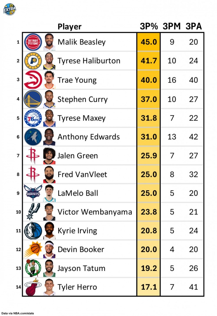 據(jù)統(tǒng)計(jì),本賽季共有14名球員在關(guān)鍵時(shí)刻(常規(guī)時(shí)間最后5分鐘或加時(shí)賽且分差不超過5分)出手了至少20記三分,這14人按命中率排名比斯利最準(zhǔn),庫(kù)里排第4,文班第10,具體如下圖: