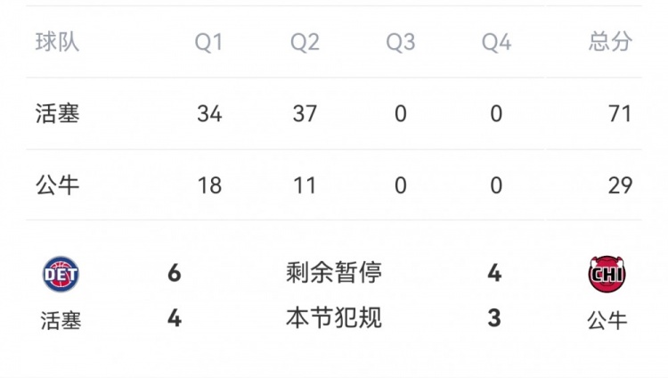 2月12日訊 NBA常規(guī)賽,活塞半場71-29領(lǐng)先公牛。