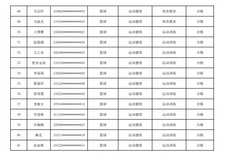 本次錄取名單中籃球項(xiàng)目共計(jì)17人,其中有多位CBA現(xiàn)役球員成績合格被錄取。參加本次考核并獲得合格成績的考生僅為通過學(xué)校資格初審,最終錄取名單以國家體育總局公示為準(zhǔn)。