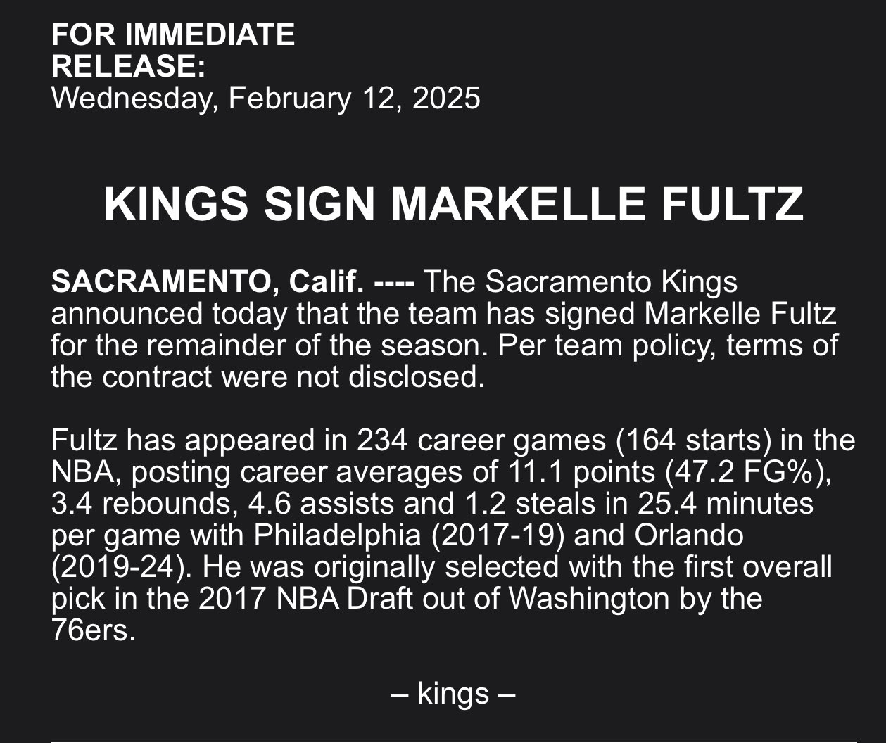 稍晚國(guó)王官宣了這一消息,并宣布和富爾茨簽約至賽季結(jié)束。根據(jù)球隊(duì)政策,合同細(xì)節(jié)未予公布。