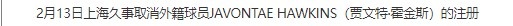 2月14日訊 今天,CBA官方更新了外籍球員注冊信息表,上海取消了因傷賽季報銷的賈文特-霍金斯。