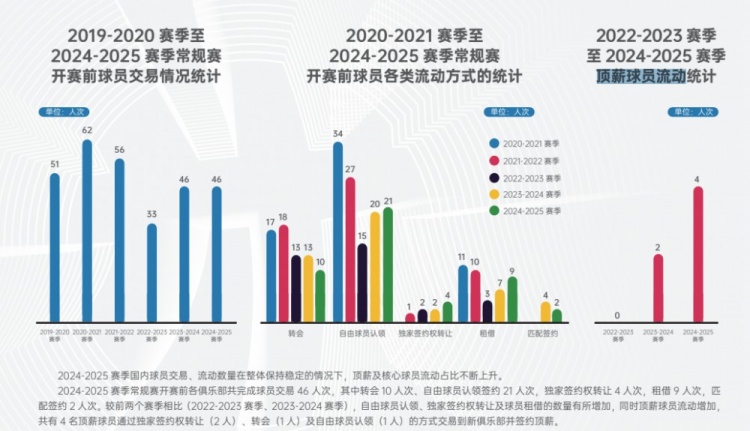 2024-2025 賽季常規(guī)賽開賽前各俱樂部共完成球員交易46人次,其中轉(zhuǎn)會(huì) 10 人次、自由球員認(rèn)領(lǐng)簽約21人次,獨(dú)家簽約權(quán)轉(zhuǎn)讓4人次,租借9人次,匹