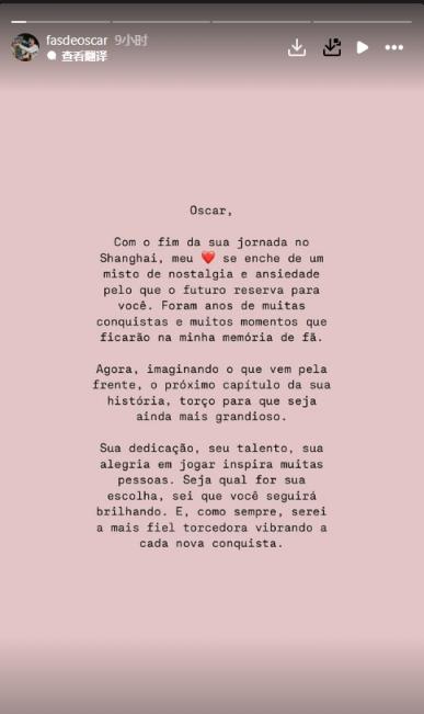 12月20日訊 奧斯卡的國外球迷團體在社媒發(fā)告別信,稱奧斯卡在中國的旅途即將結(jié)束。