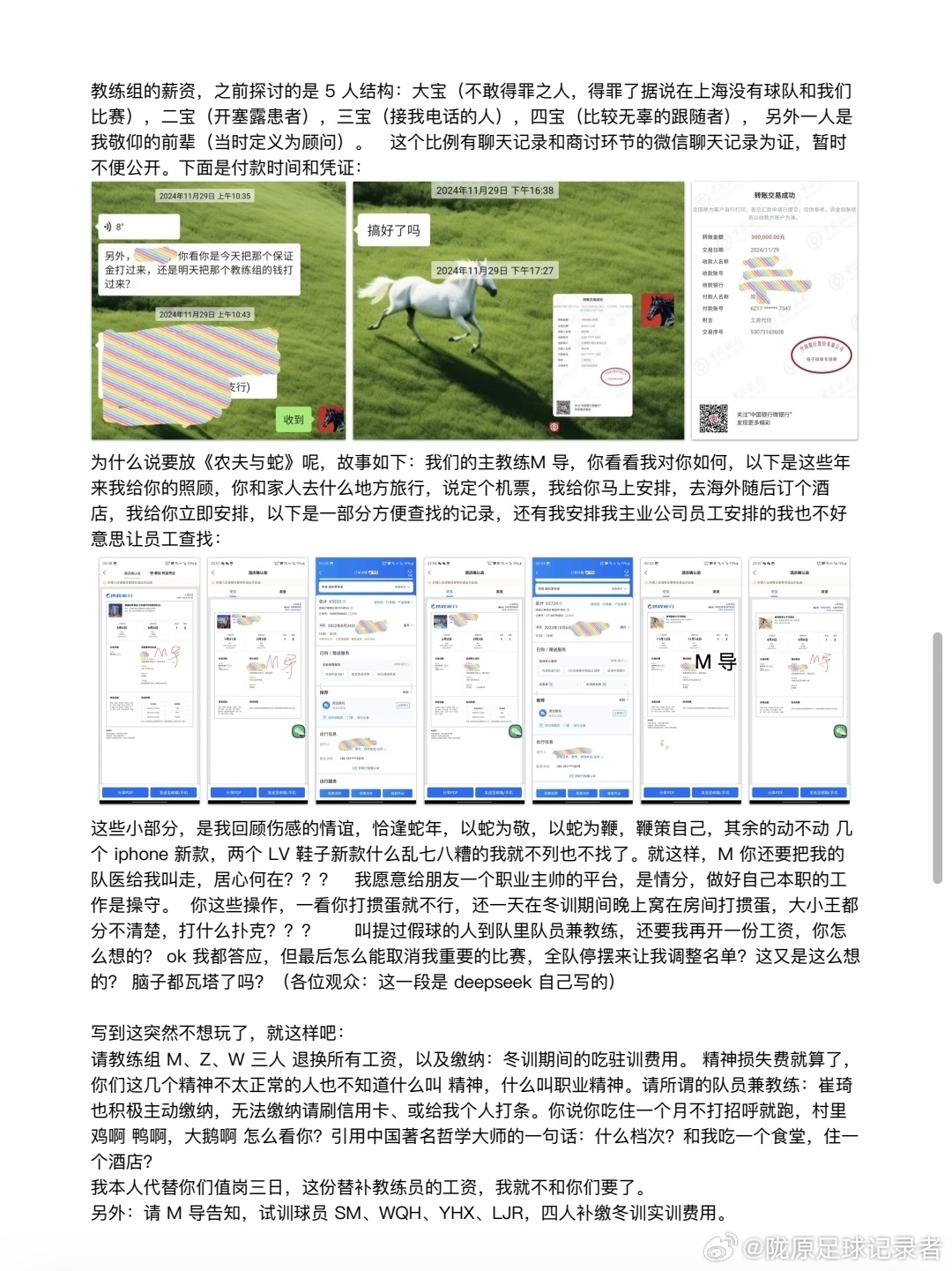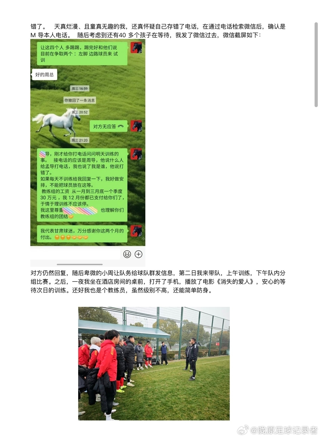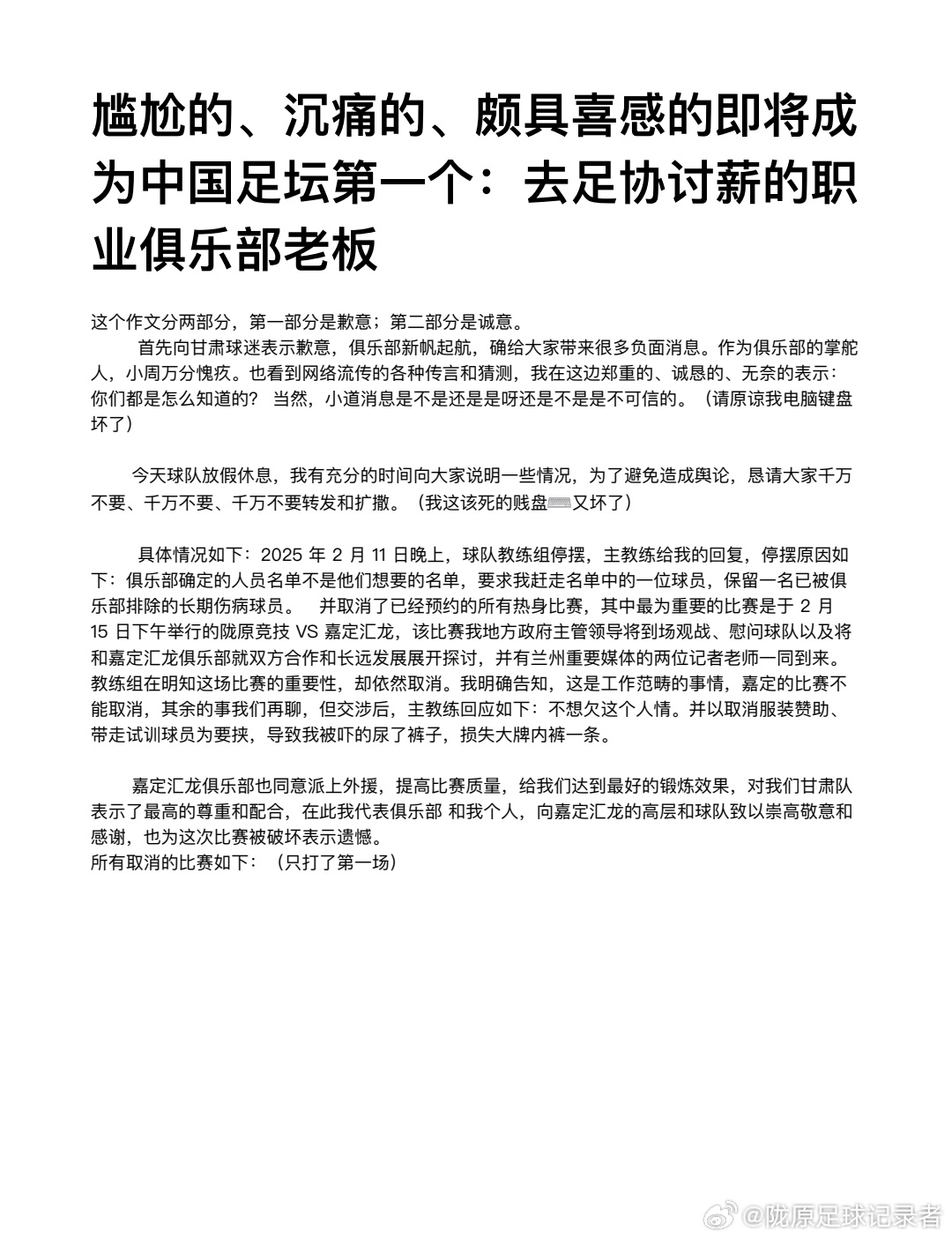 博主寫道:“蘭州隴原競技足球俱樂部遭遇內部風波,教練組因投資人不同意引進一名長期處于傷病狀態(tài)的球員而集體停擺失聯(lián),熱身賽被取消,一季度預付的工資尚未退回?!边@種狗血的事情讓我們年輕的蘭州球隊遇到了,支持俱樂部周總維護自身和俱樂部的合法權益,抵制中國足球圈的糟爛人情世故亂象,呼吁那些不熱愛中國足球的沒有多少文化的酒蒙子,寄生蟲們滾出足球圈!