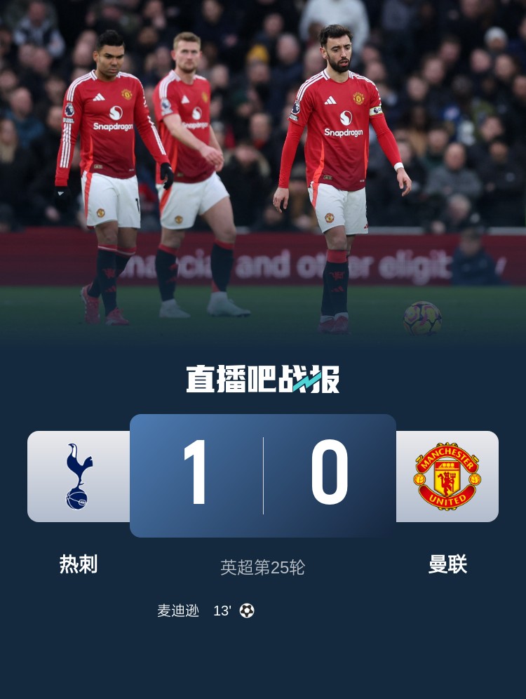 英超第25輪,熱刺主場1-0曼聯(lián),麥迪遜制勝,加納喬失良機(jī)。