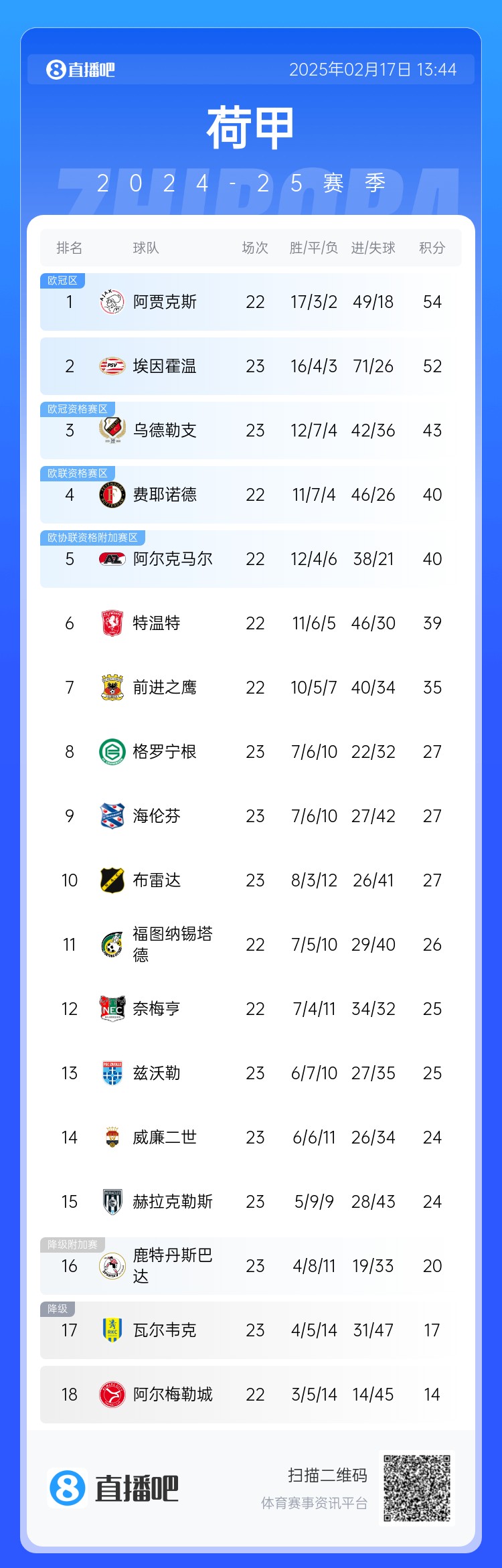 殺瘋了!賈府7連勝少賽一場(chǎng)2分領(lǐng)跑荷甲,埃因霍溫狂轟31腳憾平