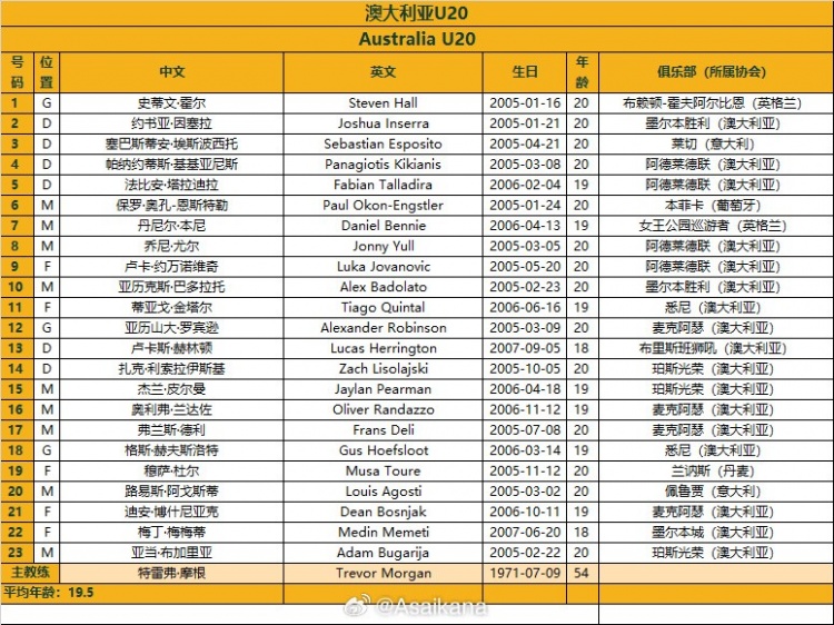 澳大利亞U20的23人名單如下圖: