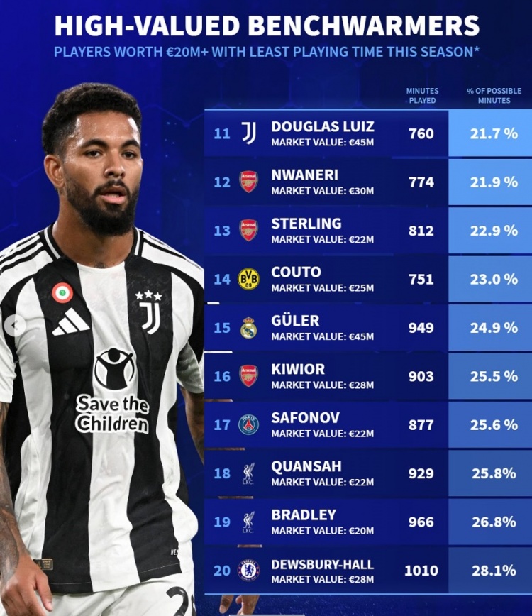 德轉(zhuǎn)列本賽季冷板凳:D-路易斯&基耶薩領(lǐng)銜,恩德里克&津琴科在列