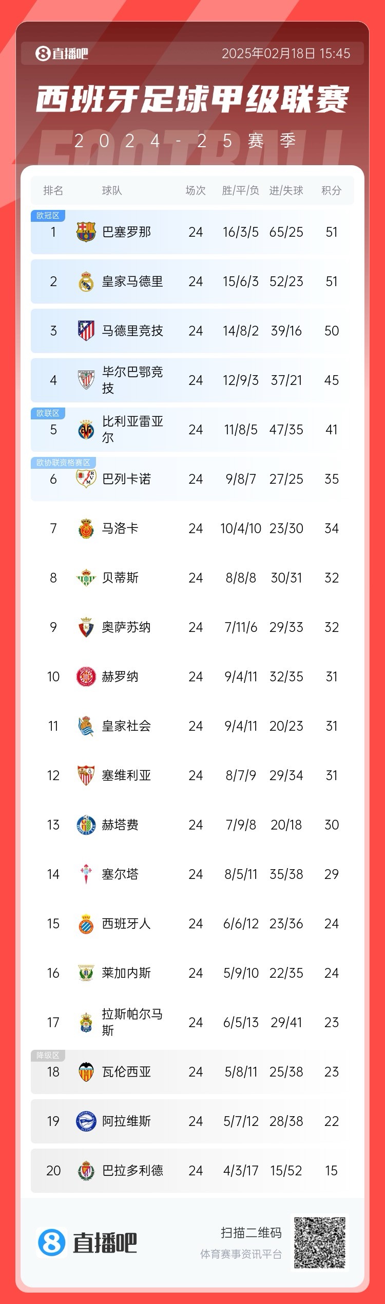 02月18日訊 本輪西甲巴薩1-0戰(zhàn)勝巴列卡諾,目前和皇馬同積51分,憑借凈勝球優(yōu)勢領(lǐng)跑積分榜。
