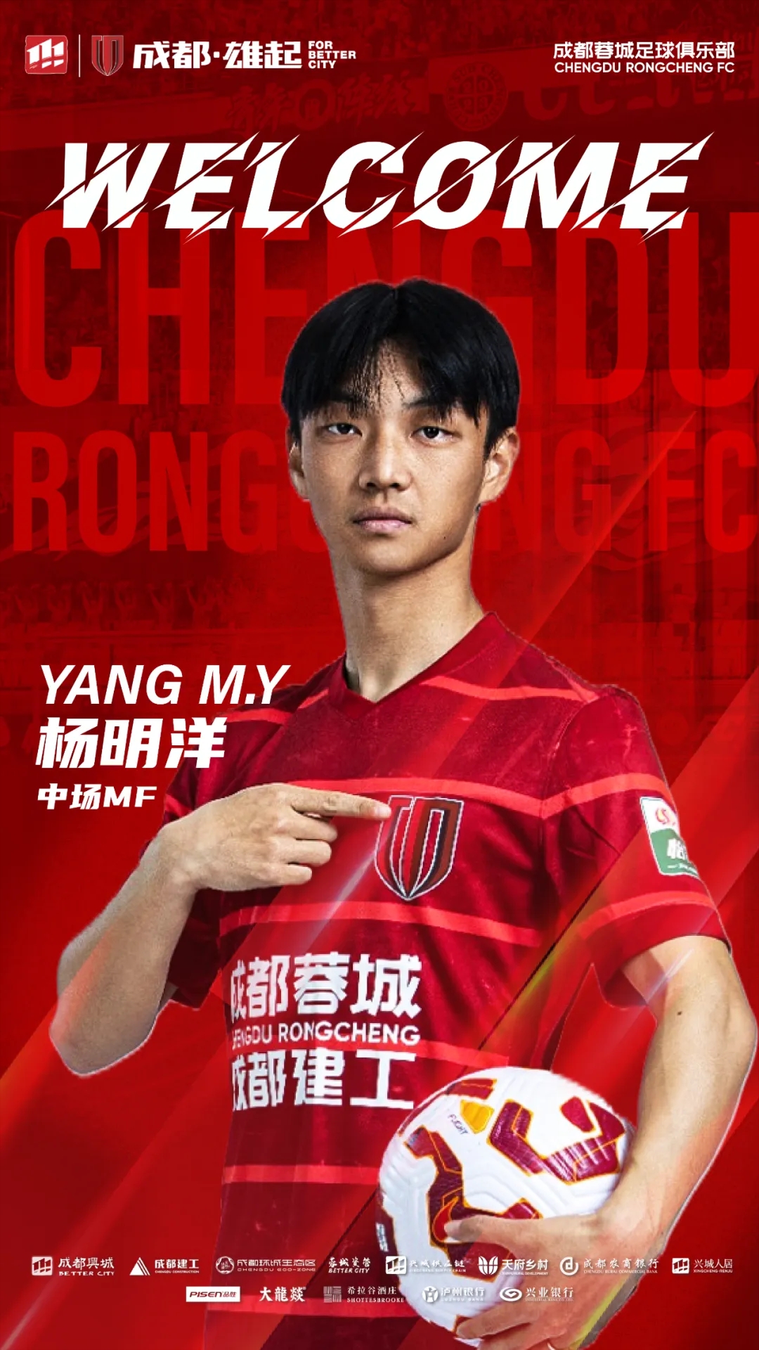 歡迎楊明洋來(lái)到成都,加入成都蓉城的大家庭。你的到來(lái),將幫助蓉城在新賽季中取得更優(yōu)異的成績(jī)!
