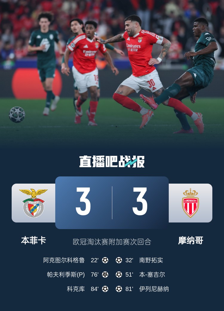 本菲卡3-3總比分4-3淘汰摩納哥晉級16強(qiáng)。