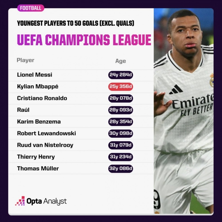 歐冠正賽50球最年輕球員排行:
