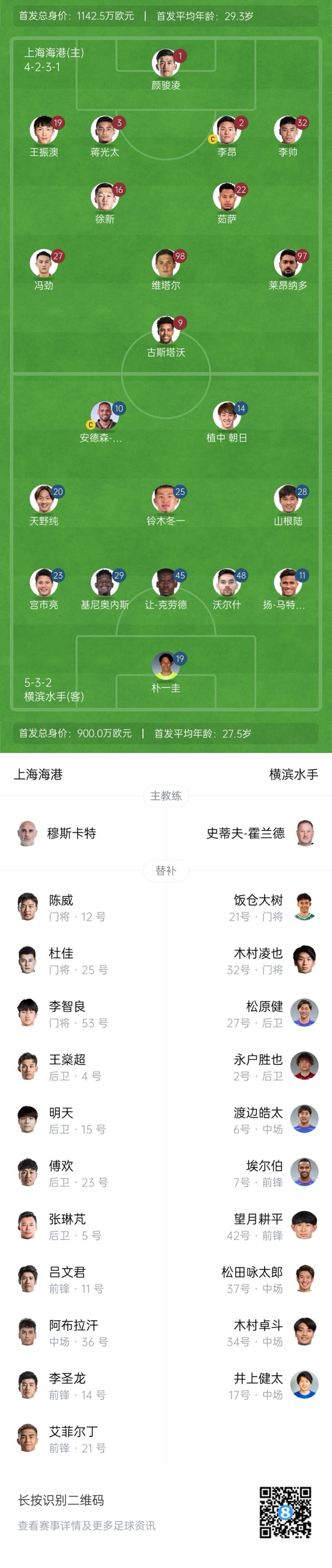 02月19日訊 北京時間今晚20點,亞冠精英聯(lián)賽東亞區(qū)第8輪,上海海港坐鎮(zhèn)主場對陣橫濱水手,賽前首發(fā)陣容公布。橫濱水手賽前更新名單,原本在替補席的39號渡邊泰基缺席比賽。
