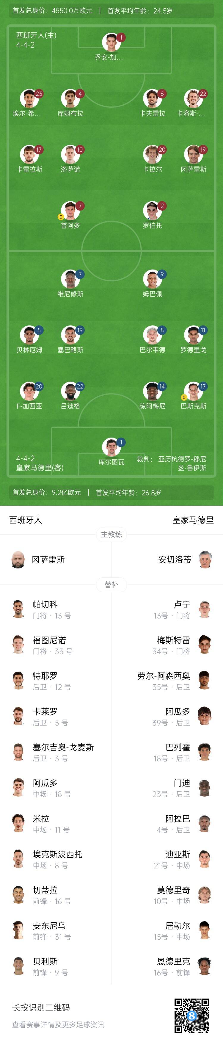 皇馬替補:13-盧寧、34-梅斯特雷、4-阿拉巴、10-莫德里奇、15-居勒爾、16-恩德里克、18-巴列霍、21-迪亞斯、23-費蘭-門迪、35-勞爾-阿森西奧、39-洛倫佐-阿瓜多