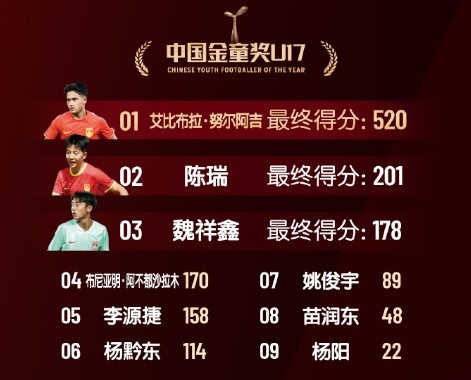 2月21日訊 足球周刊今日公布中國金球獎(jiǎng)具體的相關(guān)得分,其中金童獎(jiǎng)具體得分如下: