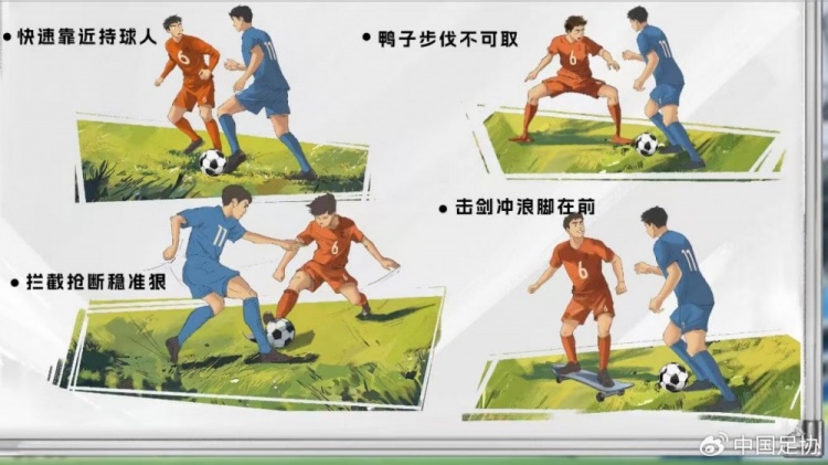 為了讓隊(duì)員們更直觀理解每堂課的內(nèi)容,宗磊特意將每項(xiàng)培訓(xùn)內(nèi)容的要點(diǎn)提煉出“七字箴言”,比如針對(duì)一對(duì)一防守,他提煉的要訣為,“快速靠近持球人,攔截?fù)寯喾€(wěn)準(zhǔn)狠;鴨子步伐不可取,擊劍沖浪腳在前”。不僅如此,他還請(qǐng)人配上了漫畫,讓人看了,一目了然。