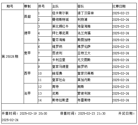 傳足勝負(fù)彩第25028期競(jìng)猜賽事涵蓋五大聯(lián)賽,其中英超曼城VS利物浦是全歐關(guān)注的焦點(diǎn),此外拜仁、尤文和皇馬等豪門也將陸續(xù)出戰(zhàn)。